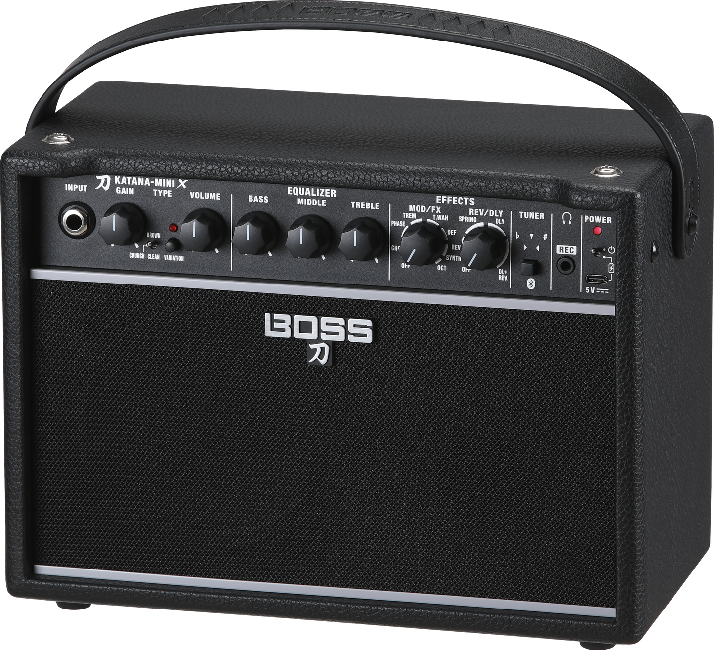 Katana-Mini X features a traditional analog tone stack for natural sound shaping using familiar bass, mid, and treble controls. MOD/FX and REV/DLY sections are also on hand, each with a diverse range of BOSS effects and fast sound tweaks via single-knob controls that adjust multiple parameters at once. Both sections can be used simultaneously, letting you create combinations such as tremolo and spring reverb, phaser and delay, and many others.