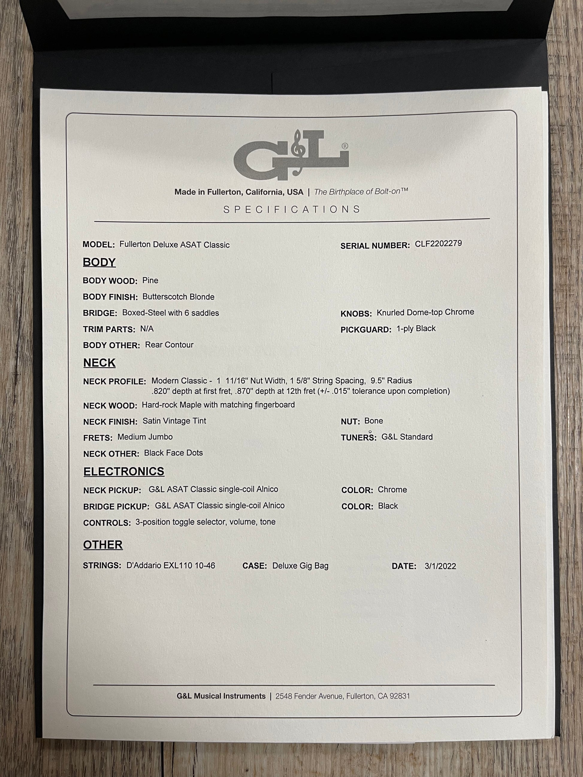 SALEG&L Fullerton Deluxe ASAT Classic Alnico Butterscotch w/bag