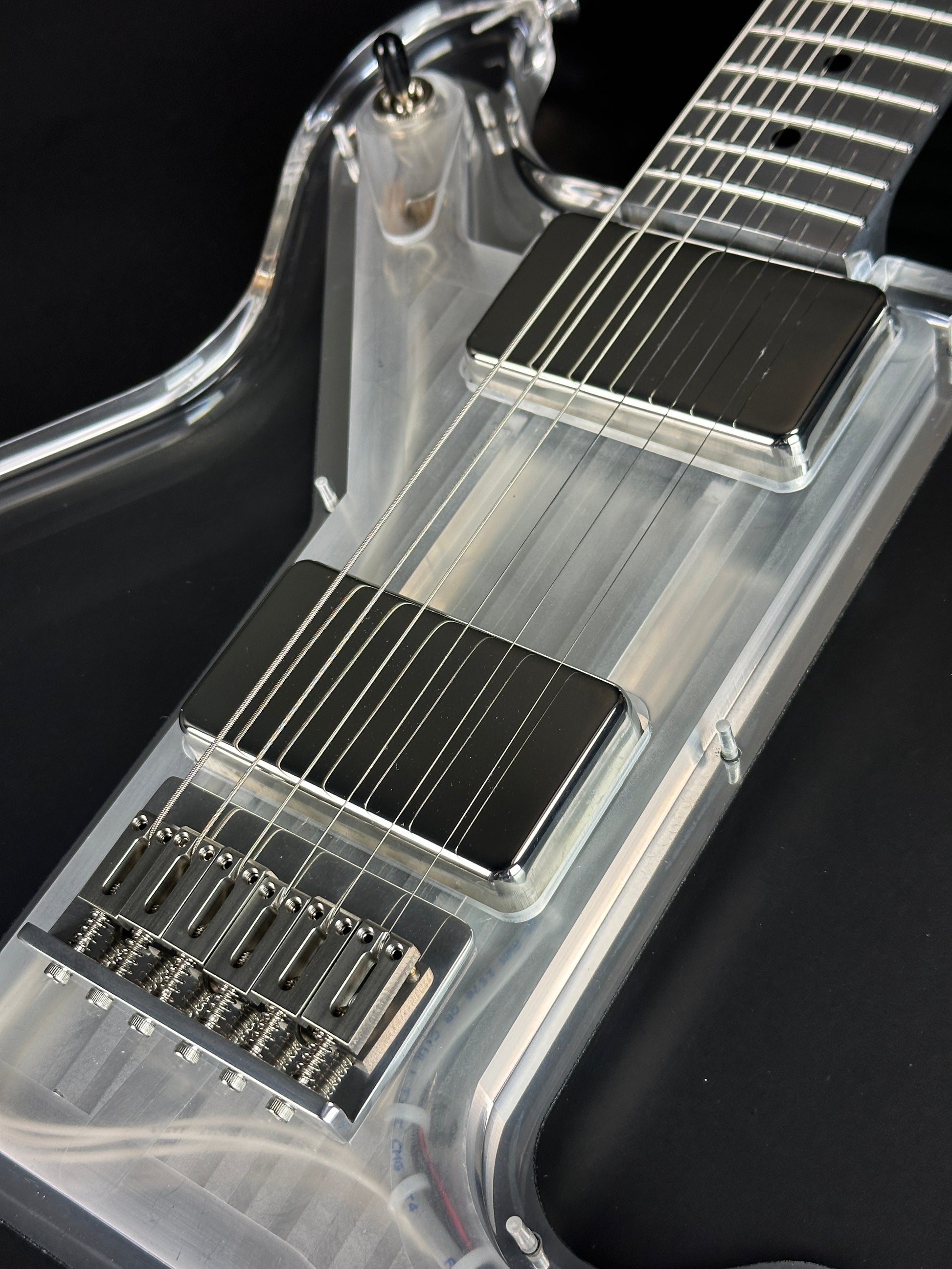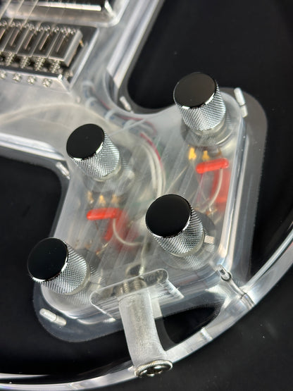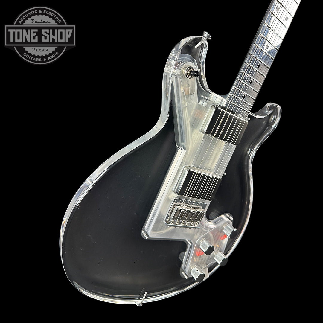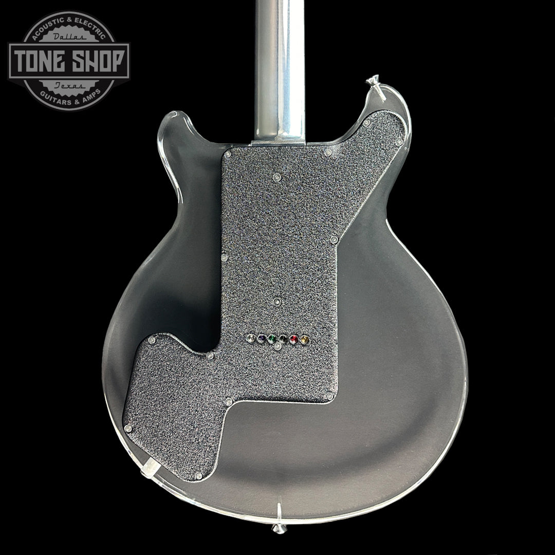 This current evolution of the King Buzzo Standard features an EGC low output humbucker in the neck and an EGC full output humbucker in the bridge position with an independent volume and tone knob for each pickup. The toggle is on the upper horn and oriented side-to-side.
