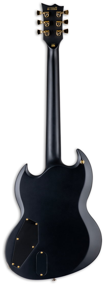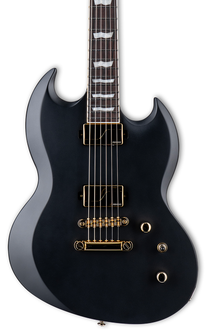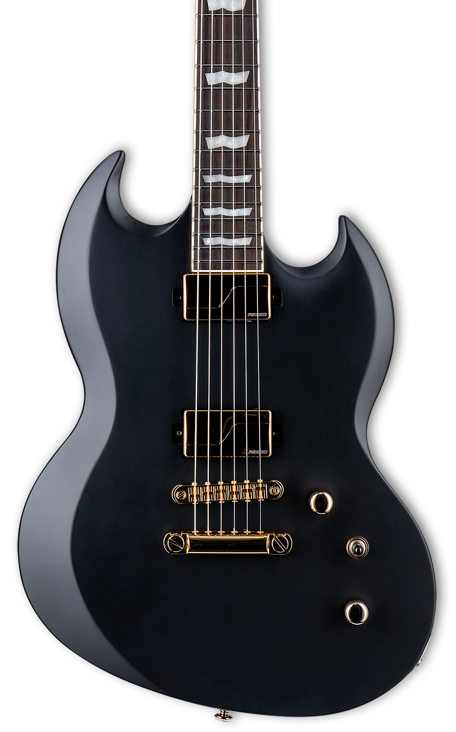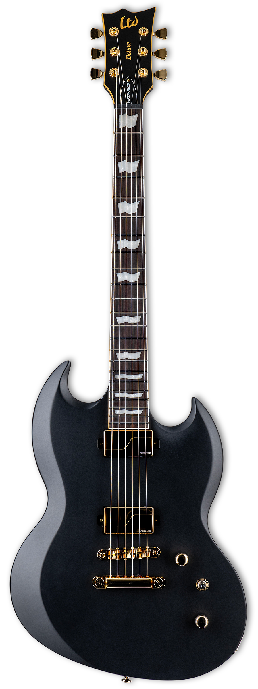 The Viper-1000 already has a diabolical look with its asymmetrical double horns, and with the addition of the Vintage Black treatment, with a matte black finish and aged-look binding on the neck and headstock, this guitar just got a whole lot meaner. Built at 24.75” scale with set-thru construction that allows smooth access to the highest frets, the Viper-1000 Vintage Black pairs a mahogany body with a three-piece thin u-shaped maple neck. Its Macassar ebony fingerboard has pearloid ESP flag inlays and 22 extra-jumbo stainless steel frets, maximizing the sweet spot for both the neck and bridge pickups to offer their ideal tones. Its premium gold hardware includes LTD locking tuners and a TonePros TOM bridge and tailpiece. The Viper-1000 includes a set of Fishman Fluence Modern Humbucker active pickups (ceramic in the bridge and alnico in the neck), with push-pull control to select voicings and gold covers to match this guitar’s noteworthy aesthetics. Each pickup offers two voices. With the ceramic bridge pickup, Voice 1 is the ultimate high-output ceramic humbucker bridge pickup tone… crisp, searing crunch, tight bass with no mud, and a growl. Voice 2 delivers modern passive attack performance that has superbly organic distortion characteristics with outstanding dynamics and response. The alnico neck pickup’s Voice 1 is Fishman’s modern active high-output tone, offering the ideal active alnico sound: full, round, and boosted, but with unprecedented articulation and dynamics. Voice 2 gives you the crisp, clean and fluid neck humbucker tone you’ve always wanted.