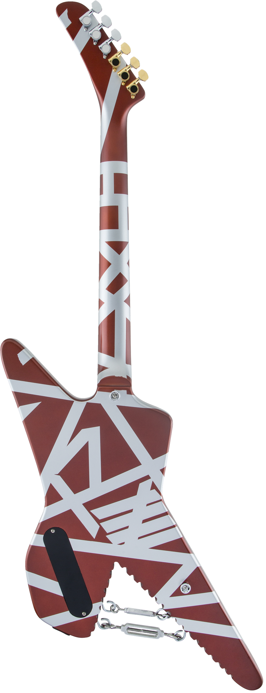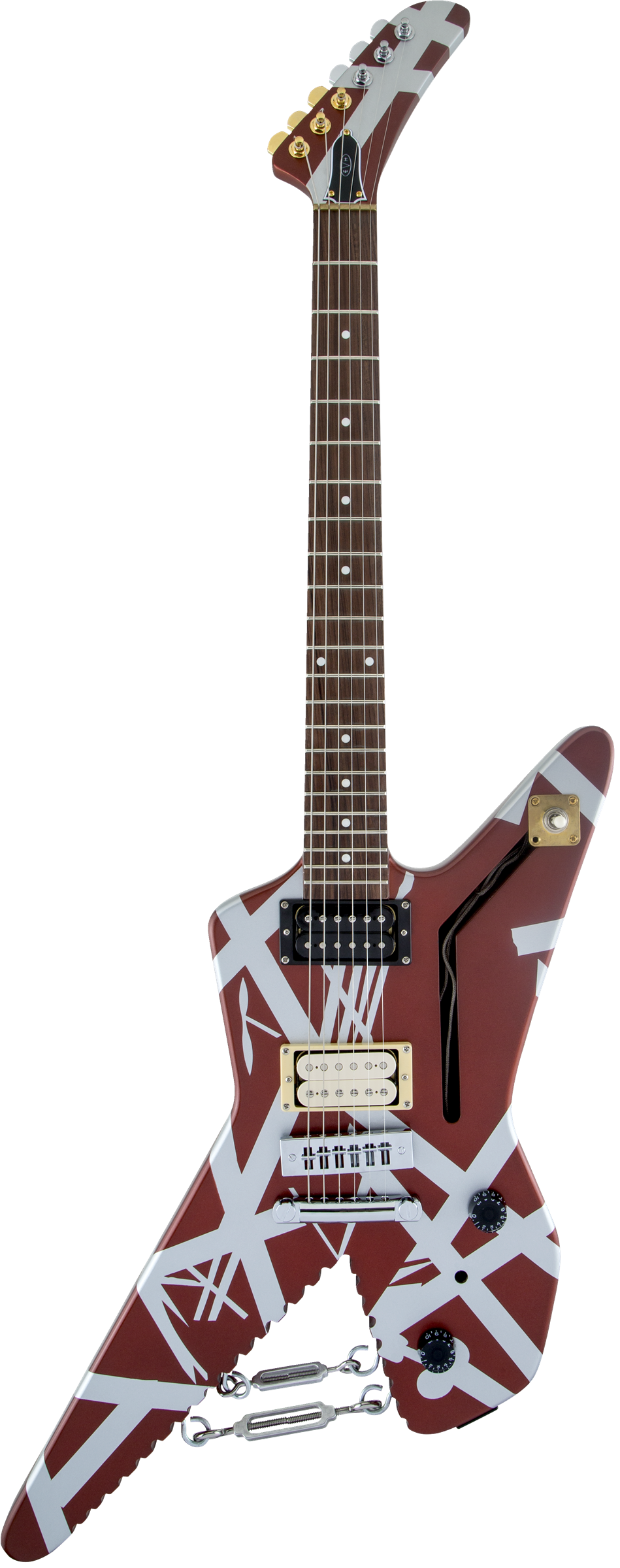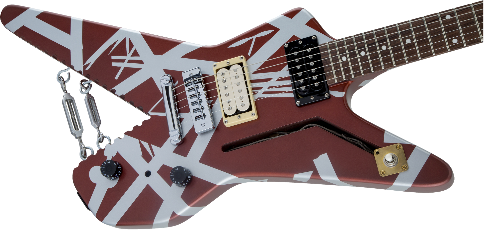 In addition to its instantly recognizable Burgundy with Silver Stripes paint job, the Shark boasts other eye-catching features including black numbered speed knobs, three-way toggle switch housed on a brass mounting plate, brass nut, gold and chrome custom EVH-stamped Gotoh® tuners and chrome eye hooks with turnbuckles.