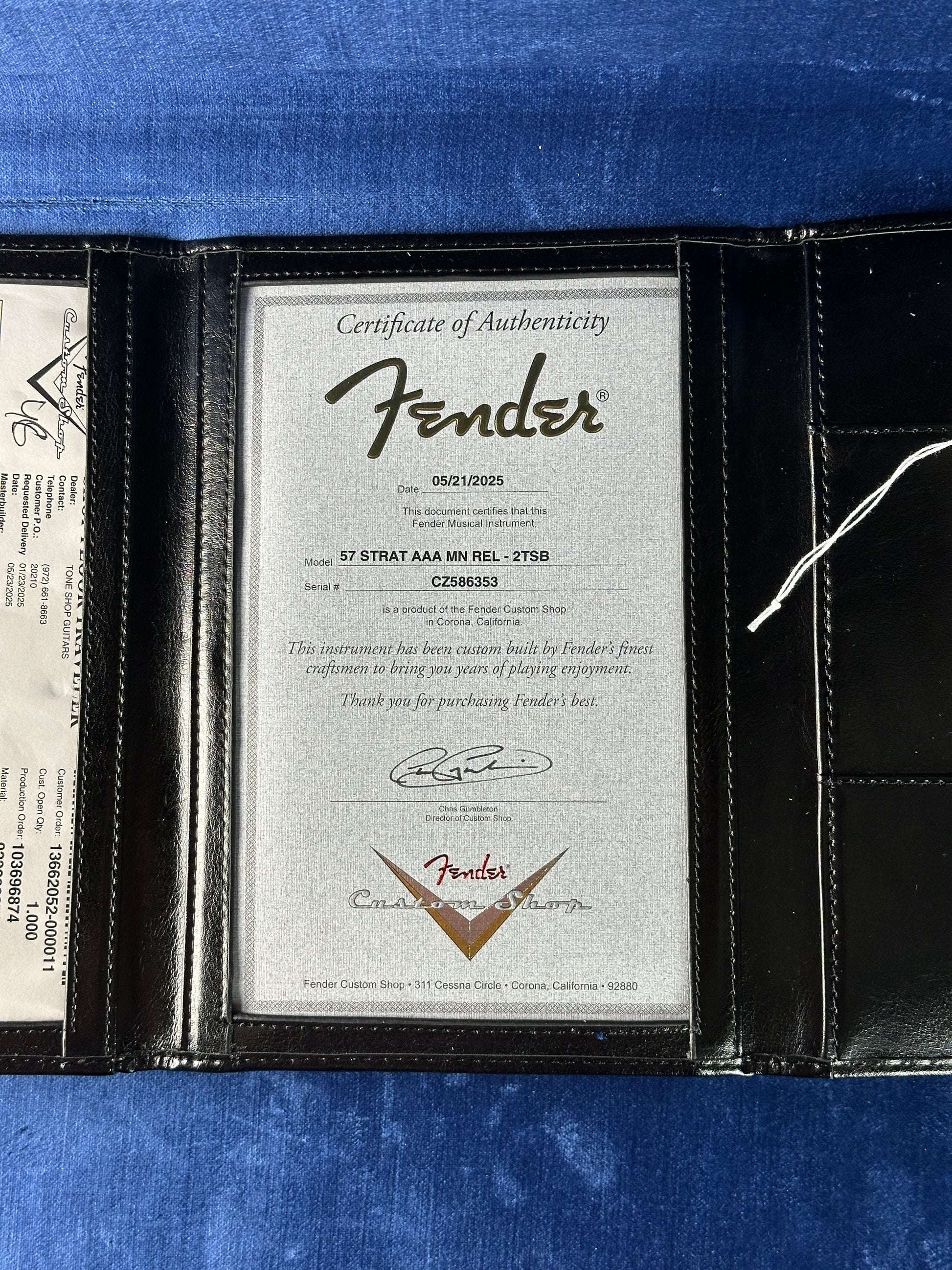 The Fender Custom Shop 1957 Stratocaster Relic in 2-Tone Sunburst brings the golden era of Fender to life, blending vintage style with Custom Shop craftsmanship and modern comfort. Featuring a premium AAA flame maple neck with a soft ’57 “V” profile, a lightweight two-piece ash body, and a finely aged nitrocellulose lacquer finish, this Strat looks, feels, and sounds like a true vintage icon.