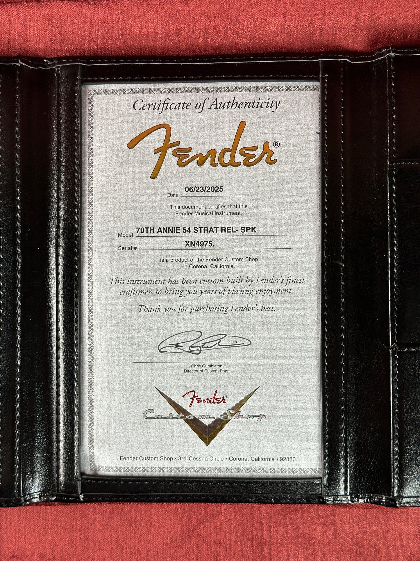 With an off-center 2-piece ash body, authentic 1954 body contours, and hand-wound Fat ’50s pickups, this Stratocaster delivers iconic bell-like tones, punchy mids, and sparkling highs. The AAA birdseye maple neck with a soft “V” profile, 9.5” radius, and narrow tall 6105 frets offers modern comfort while preserving that unmistakable vintage vibe. Collector details abound, from the commemorative 70th Anniversary headstock decal and engraved backplate to period-correct eggshell relic pickguard and aged chrome/nickel hardware.