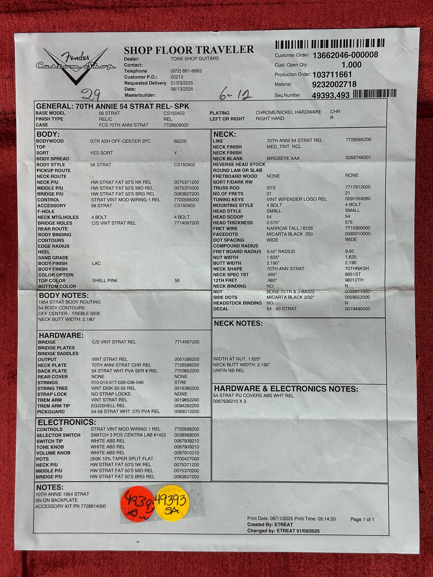 - Commemorative Details: 70th Anniversary headstock decal, backplate serial, Shell Pink relic finish