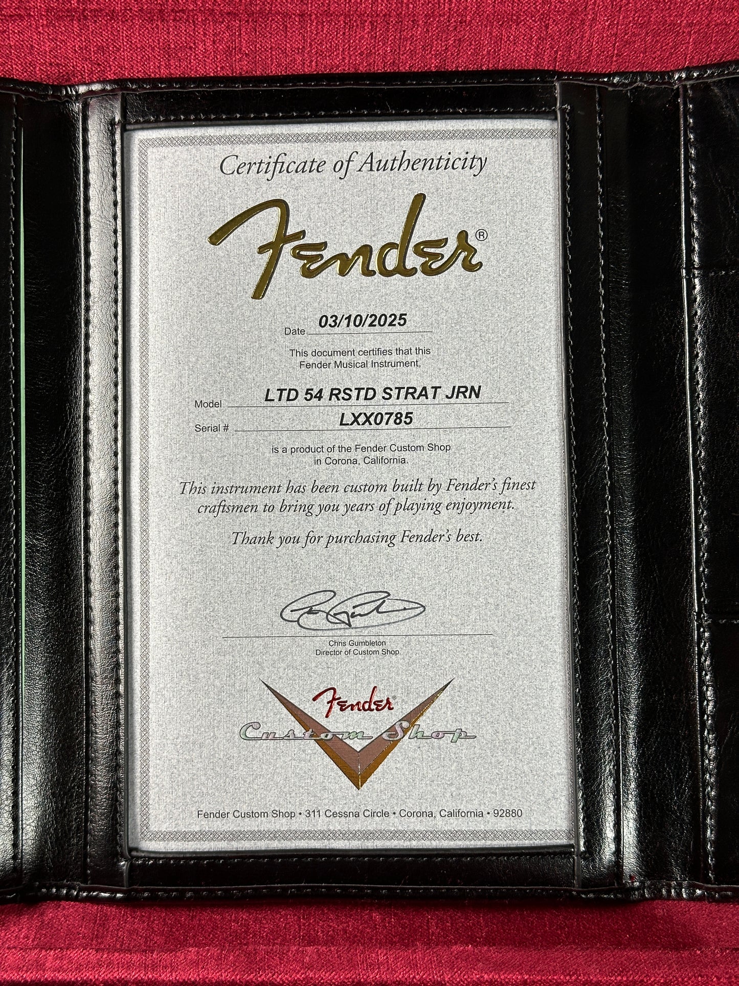 The one-piece roasted quartersawn maple neck is fashioned with a special 70th anniversary Soft “V” profile based on an incredible Strat® neck from July 1954, topped by a 9.5”-radius fingerboard with 21 narrow tall (6105) frets and a 1.625” bone nut. Three Custom Shop hand-wound ’54 Strat® pickups deliver that classic Strat® voice with clear, bell-like highs, routed through vintage '54 Strat® wiring with wax paper cap and five-way switching.