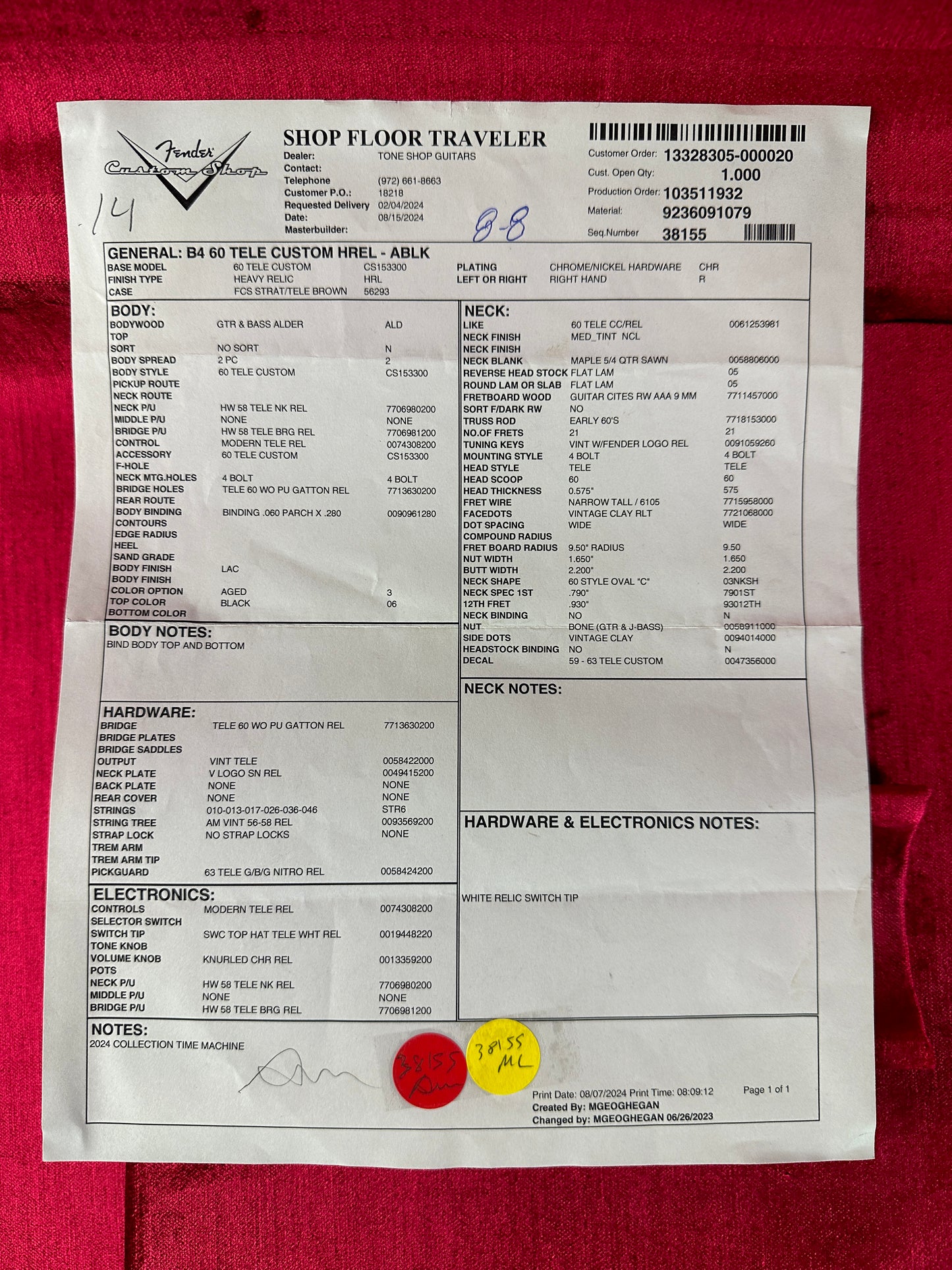 Other premium features include '60-style Oval "C" back-shape, 9.5" radius, 21 narrow tall (6105) frets, Modern Tele wiring, 3-way switch, '60 Tele bridge with Gatton saddles, vintage-style tuning machines, bone nut, wing string tree, deluxe hardshell case, strap and certificate of authenticity.