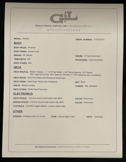 Open Box G~andL USA Doheny Sunset Coral Matching Headstock w/case 6.10lbs