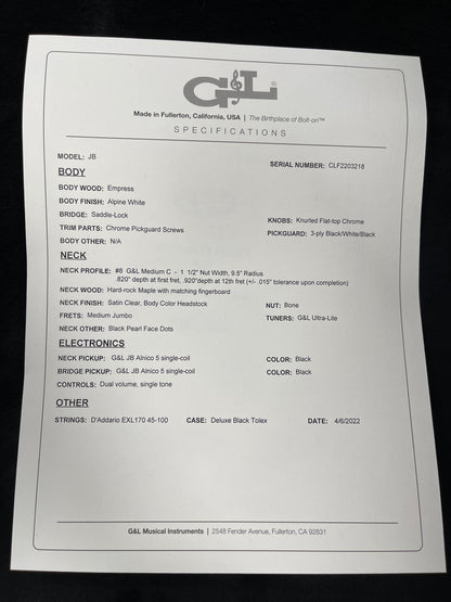 G&L USA JB Jazz Bass Alpine White Empress Painted Headstock w/case