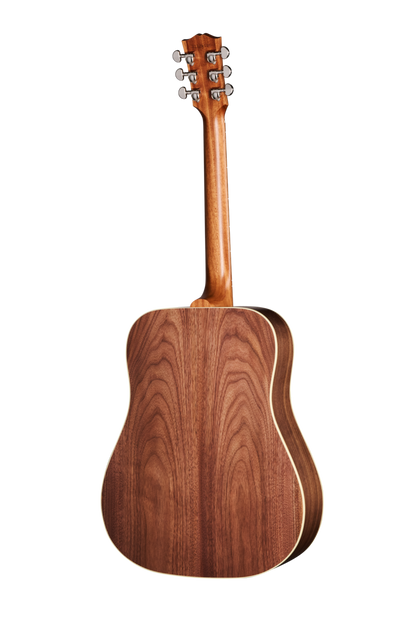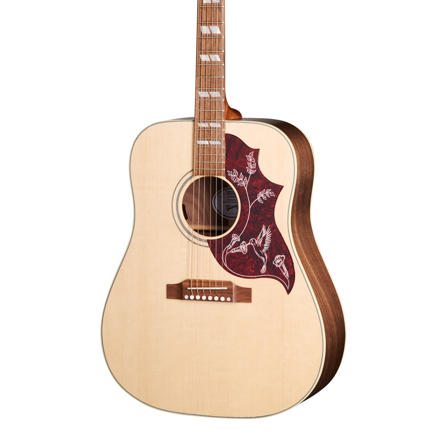 The Hummingbird Studio Walnut continues Gibson’s long history of producing world-famous square shoulder body designs, such as the Hummingbird, Dove, and Songwriter models. The Hummingbird Studio Walnut is handcrafted by Gibson’s expert luthiers in Bozeman, Montana, using all-solid tonewoods, including a gloss nitrocellulose lacquer-finished Sitka spruce top for wide dynamic range, playing responsiveness, and balanced tone. The satin nitrocellulose lacquer-finished walnut used for crafting the back and sides delivers a balanced tonal response that is warm and rich-sounding with a bit more bass and treble than the traditional mahogany-bodied Hummingbird models but not quite as much as the rosewood-bodied versions. The Hummingbird Studio Walnut’s full-depth body ensures rich, deep tone and excellent volume and projection. The Hummingbird Studio Walnut is equipped with an Advanced Response profile and satin nitrocellulose lacquer-finished utile neck for smooth, easy playability. The Advanced Response neck profile sits in between some of the other Gibson neck profiles and is not too large or too thin but sits “just right” in the hand for many players. The walnut fretboard has 20 standard-sized frets and is adorned with the classic mother-of-pearl parallelogram inlays that are one of the visual hallmarks of the classic Hummingbird design. The fretboard’s 16” radius makes playing fast passages easy and efficient, contributing further to the model’s excellent playability. You’ll find yourself reaching for this guitar again and again since playing it is so much fun. The headstock is equipped with smooth-operating Grover Rotomatic tuning machines and a Graph Tech TUSQ nut for excellent tuning stability so you can spend more time playing and less time tuning. The saddle and bridge pins installed on the walnut bridge plate are also TUSQ. The Hummingbird Studio Walnut’s pickguard graphics deliver another classic Hummingbird visual touchstone. The Hummingbird Studio Walnut has an L.R. Baggs Element Bronze active touchstone. The Hummingbird Studio Walnut has an L.R. Baggs Element Bronze active under-saddle piezo pickup with a quick-to-access soundhole-mounted volume control for easy studio-quality plug-and-play anywhere. Packaged in an included modern hardshell case for portability and protection, the Hummingbird Studio Walnut is an outstanding musical companion that is ready to join you wherever your muse takes you.