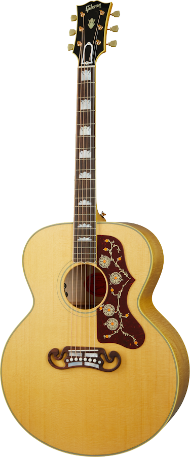 The Gibson SJ-200 is the world's most famous acoustic guitar and earned its designation as the "King of the Flat-Tops." Since its release in 1937, its wide use by American artists of this century has made the Super Jumbo one of the most widely played acoustic guitars of our time. The most striking features of the new SJ-200 Original include the carved four bar Moustache bridge, an engraved tortoise pickguard, mother-of-pearl crown fretboard and headstock inlay, and exquisite flamed maple back and sides. The SJ-200 is an American original with its shape and elegant appearance.