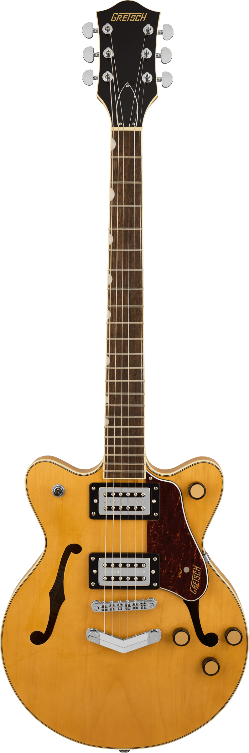 Its smaller double-cutaway arched maple body with a chambered center block provides resonant warmth and clarity while keeping the guitar light and feedback-resistant. The all-new Broad'Tron™ BT-3S humbucking pickups produce full-bodied mids, articulate highs, and tight lows—delivering a dynamic, powerful Gretsch voice that works for rock, blues, indie, and more.
