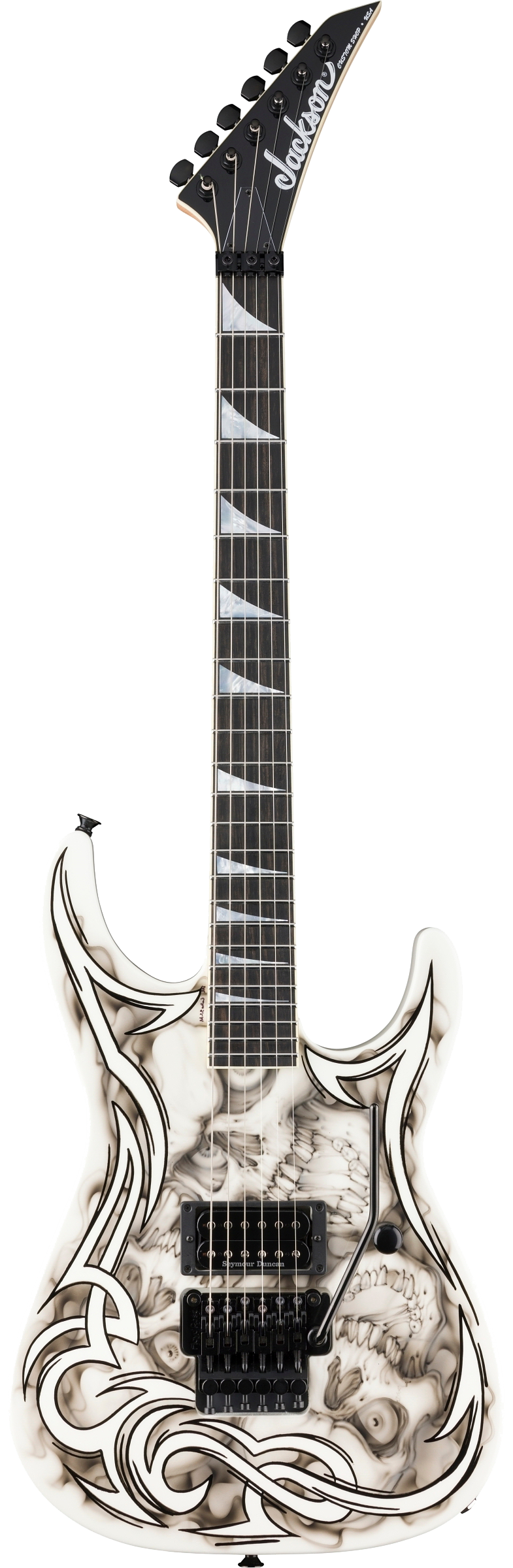 Custom Skull Tribal Artwork by Mike Learn; High-Gloss Urethane Finish; Premium Alder Body Wood; Oil Finished Quartersawn Maple Bolt-On Neck Construction; Ebony Fingerboard; 6-In-Line Pointy Jackson® Headstock; Ivoroid Neck and Headstock Binding; Mother-Of-Pearl Sharkfin Fingerboard Inlays; Dual-Action Truss Rod; 24 - Stainless-Steel Jumbo Frets; Black Position Markers; .750" at 3rd Fret and .810" at 12th Fret Neck Carve; Floyd Rose® Locking Nut; Black Floyd Rose® Recessed Double-Locking Tremolo System Bridge; Single-Humbucker Pickup Rout; Black Pickup Ring(s); Seymour Duncan® JB Model™ Black Bobbins Bridge Pickup; Black Gotoh Tuning Keys; 500k Master Volume Pot; Black Knurled Metal Dome Knob(s); ; Black 17mm Strap Buttons; .009" to .042" Strings; 80's Style Black Jackson® Logo; Molded Hardshell Case; Certificate of Authenticity.