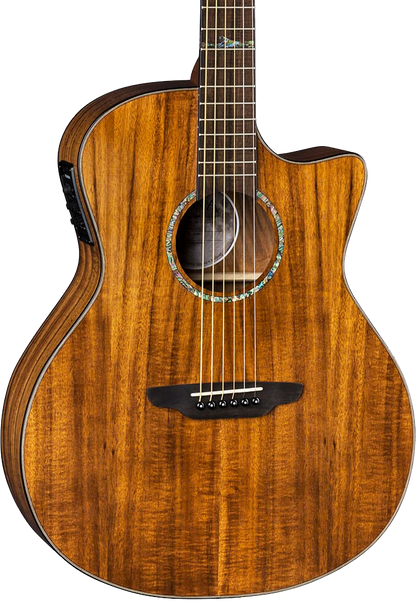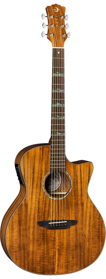A perfect complement to Lunas premier line of High Tide ukuleles, the High Tide line of acoustic guitars focuses on sharp visually appealing aesthetics and high-quality features including the Fishman Presys+ preamp with a built-in tuner as well as DAddario strings. The High Tide Koa sports a grand concert body with a cutaway, allowing comfortable access to the upper frets and is carefully crafted using an all koa body, producing a rich vibrant tone. The High Tide Series takes its inspiration from the full moon at the first fret which causes the abalone wave fret markers below it to "rise" as they make their way up the fretboard towards the moon's pull. These guitars are crafted from exotic tropical hardwoods, and the Luna "full moon" sticker inside the sound hole is framed by an abalone ring. The High Tide Koa is complete with open gear tuners, abalone wave inlays under a pearl moon and an overall smooth satin natural finish. This grand concert cutaway is perfect for musicians that like their guitars to sound as sharp as they look, making sure to set a good impression on the big stage. Join the Luna Tribe!
