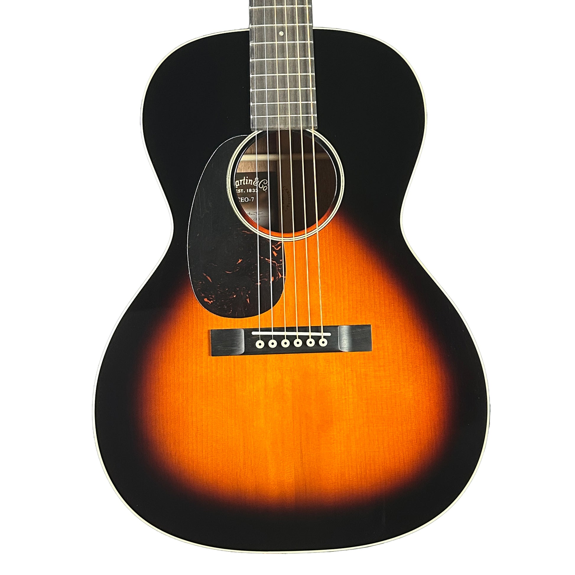 Reminiscent of models from the “Golden Era”, the CEO-7 features a sunburst finish, golden age tuners and authentic headplate lettering. This new 14-fret short scale 00 “sloped shoulder” model features a solid Adirondack spruce top with solid mahogany back and sides for complex tonality