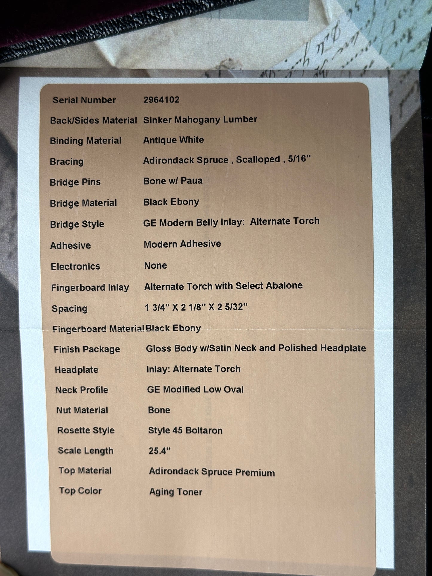 - Headplate: Sinker Mahogany, Alternate Torch inlay (Select Abalone)