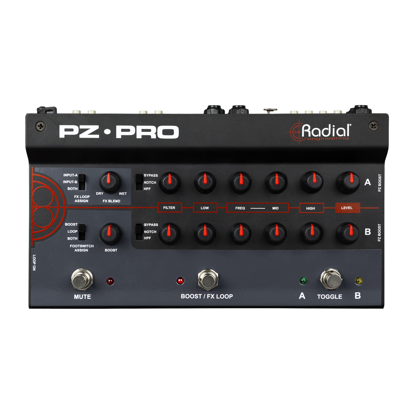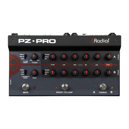 The PZ-Pro is highly configurable, so you can adapt it to meet the needs of your performance, instead of changing your performance to fit the limitations of your gear. Connect magnetic pickups, instruments with on-board preamps, or piezo transducers, and optimize the sound of each with powerful EQ controls and a variable notch or high-pass filter. Blend an instrument mic with your pickups, switch between two instruments, or connect a vocal microphone and feed it through your guitar pedals. The FX loop can be assigned to channel A, B, or both at once, and you can activate it with a footswitch or assign it to be always on, saving footswitch control for the variable clean boost function. With the PZ-Pro, you get the durability and performance Radial is known for, along with all the features you need to put on an unforgettable show.