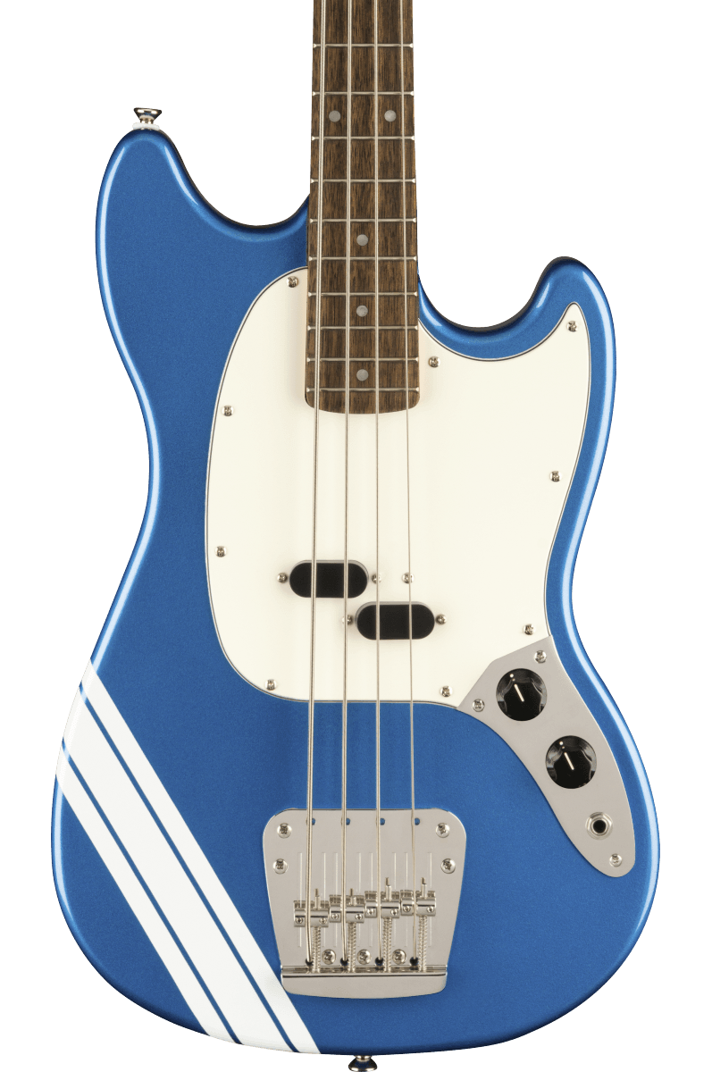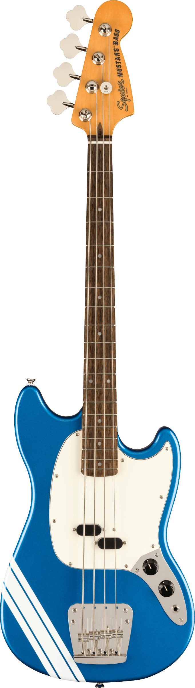 Squier FSR Classic Vibe 60s Competition Mustang Bass Parchment Pickguard Lake Placid Blue w/Olympic White Stripes