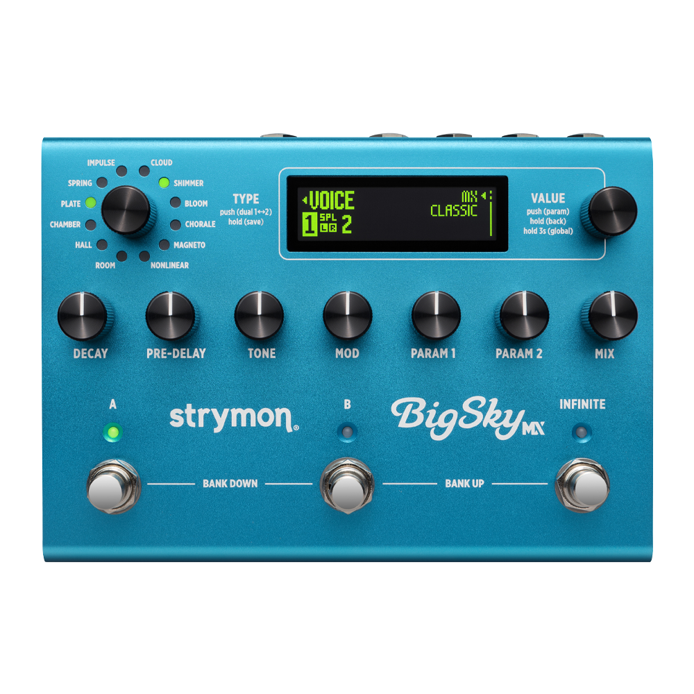 The new BigSky MX is a world-class reverberator that packs a host of powerful features into a single enclosure: it uses a tri-core 800 MHz ARM processor to achieve two reverb machines at once, with Series, Parallel or Split audio routing and new panning controls. Of the 12 reverb machines, seven are brand new and the remaining classic machines all get powerful sonic and feature upgrades. The new convolution engine is capable of playing ten-second stereo impulse responses, along with the ability to fully edit the IRs. 22 impulses come preloaded, including a large number of custom long captures of classic analog studio gear. Stereo I/O, DIN and TRS MIDI I/O and USB-C round out the connections, and a new OLED screen, dedicated Inifinite/Freeze footswitch and multiple footswitch modes make it easier to control than ever.
